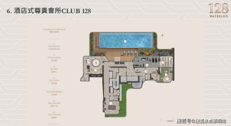 128 Waterloo于1楼及2楼设有6,221尺住客会所,配有泳池、健身房、瑜伽室、桌球室及童趣天地等,从个人阅读到举办活动招待亲朋都可以在Club128一一实现。