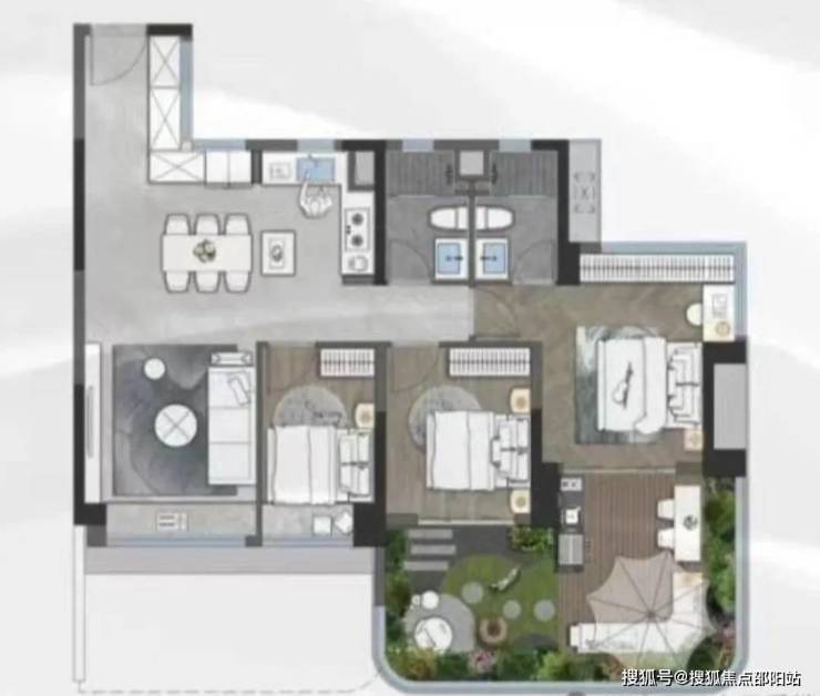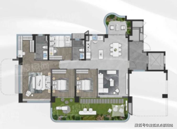 该户型把赠送面积都给了工区和主卧,全屋做到4+1房,空中花园连通公区,面积达到73㎡。最牛的是,主卧还带约14㎡的空中花园,打造一个私享庭院。