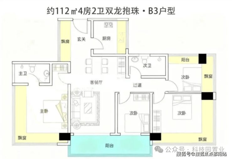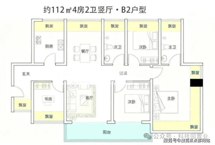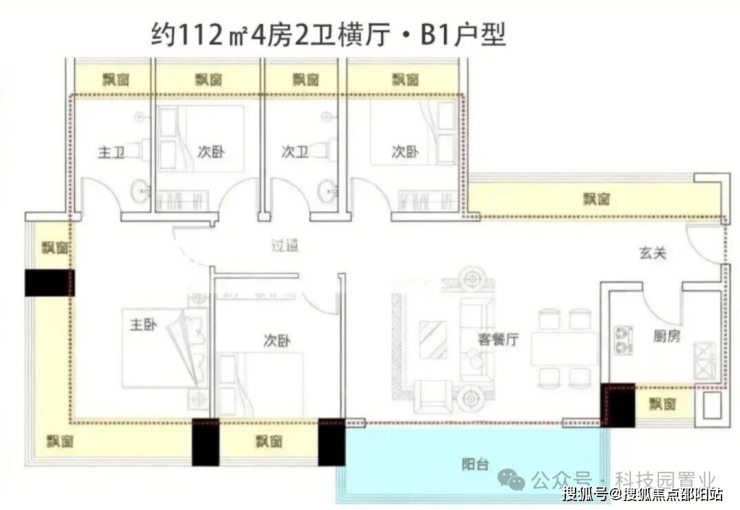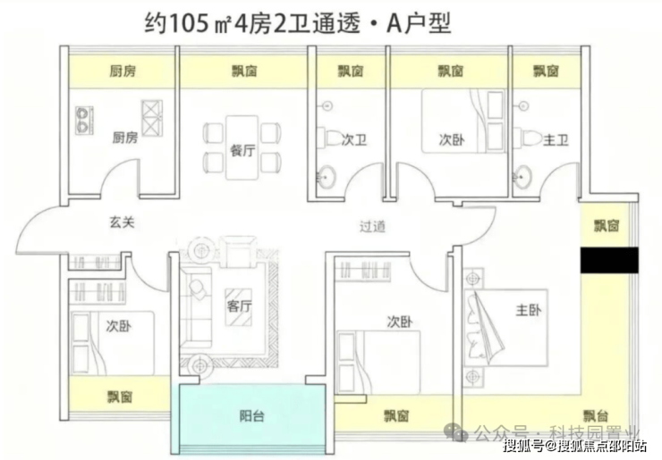 约105-122㎡四房:作为“功能型品质起步”户型,凭借新规下的高实用率(包含赠送得房率约100%)。主卧均带270°环绕式飘窗,户型设计通过飘窗“送了不少面积。