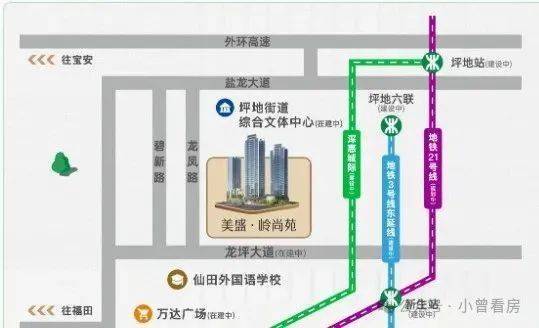 3号东延线“坪西站”距离约1.1公里,“新生站”距离约1.3公里,深惠城际“坪地站”距离约2.3公里,可以乘坐3号东延线1站到国际低碳城,再换乘坪地站。周边还有盐龙大道,龙岗大道,深圳外环高速等主干道,1小时可通勤宝安。