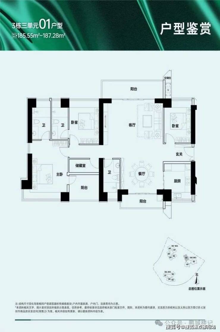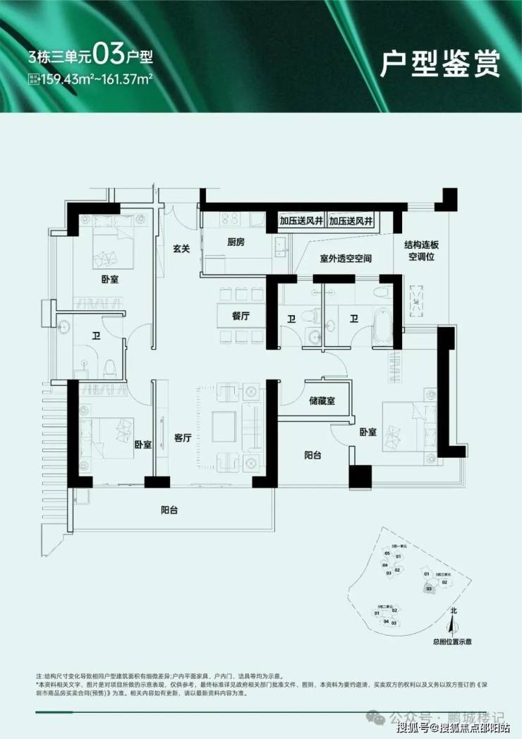 项目A区总户数1014户,由1栋、2栋、裙房组成,其中1栋分为五个单元,一栋一单元为保障房共331户,一栋二单元至五单元为商品住宅共683套,户型面积包括109-112㎡三房两厅两卫、121㎡四房两厅两卫、157-159㎡五房两厅三卫和168-169㎡五房两厅三卫。