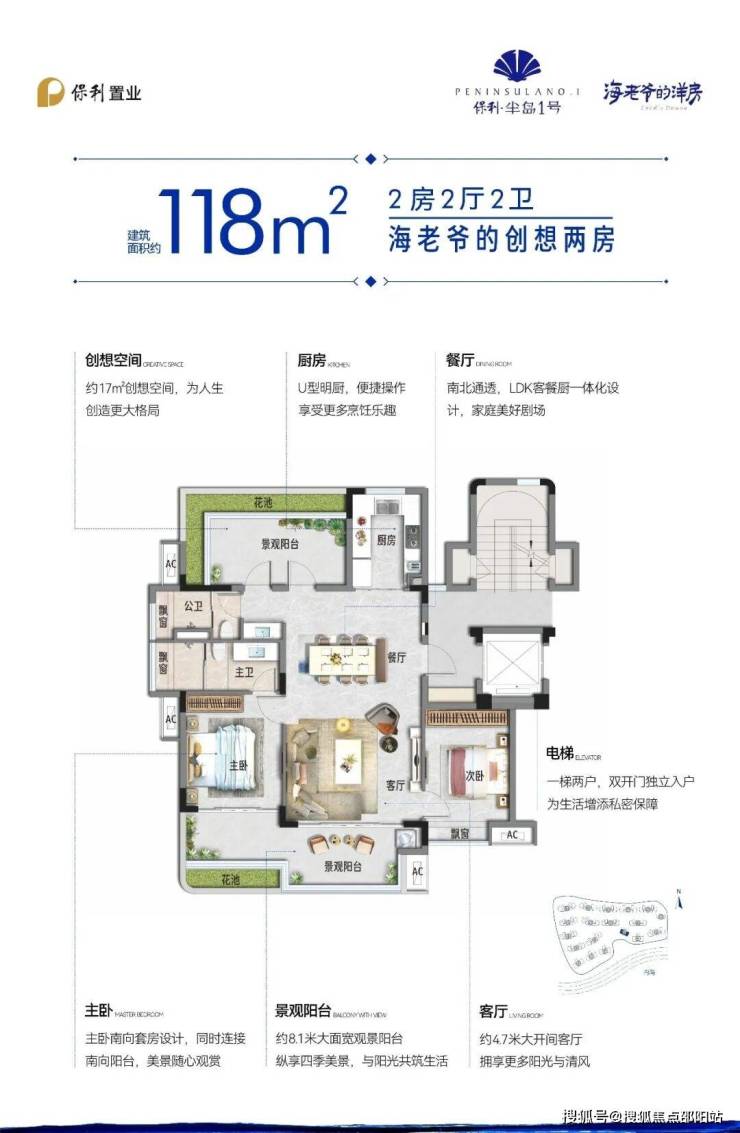 约8.1米大面宽阳台,约4.7米大开间,预留约17㎡创想空间