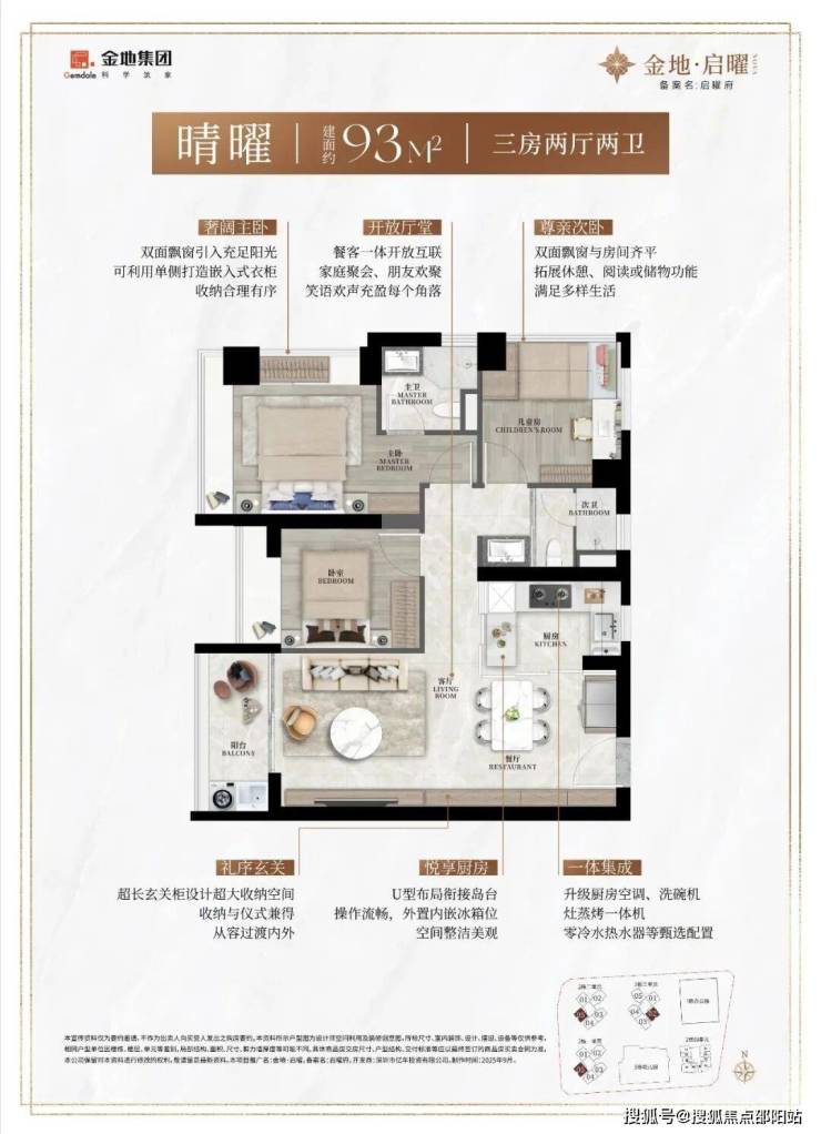 93㎡的3房2厅2卫,2栋1/2单元05户型/2栋3单元02户型,设计的是竖厅格局,LDKB一体化设计,动静分区,三开间朝南,主卧+次卧270°转角飘窗,U型厨房,公卫三段式干湿分离,得房率约90%(包含赠送),西南或东南朝向。