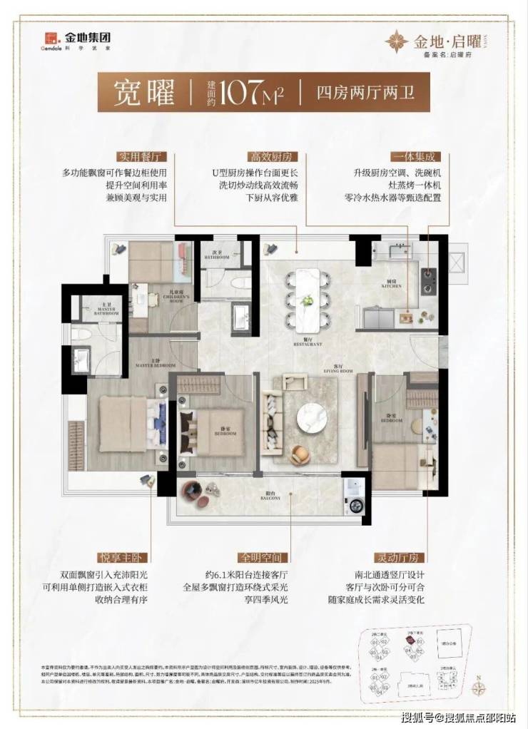 107㎡的4房2厅2卫,设计的是竖厅南北通透格局,客餐厅分离设计,四开间朝南,主卧270°转角飘窗,U型厨房,公卫三段式干湿分离,得房率约90%(包含赠送),客厅连接餐厅出6.1米长的大阳台,西南朝向。