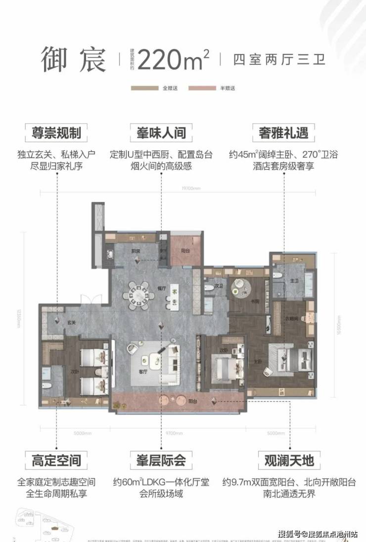 220㎡户型亮点:独立玄关,私享电梯厅,极具私密性和独立性;定制 U 型中西厨、配置岛台,烟火间的高级感;约 60㎡LDKG 一体化厅堂,会所级场域;约 9.7m 双面宽阳台、北向开敞阳台,南北透通无界;约 45m 阔绰主卧、270° 卫浴,酒店套房级奢享。✨✨