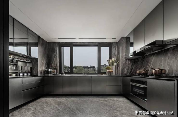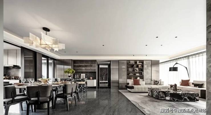 餐厨区域着重对生活品质的渲染,金属质感的厨房收纳更能激发出大体块空间的力量感。黑白大理石岛台成为空间焦点,艺术吊灯融入船帆的元素,使空间的仪式感在细节处绽放。🌟🌟