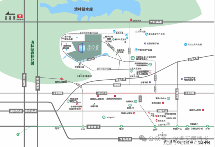 项目距外环高速五联出入口车行距离约1.2KM,快速畅达龙华、宝安、光明等中西部核心区。自配建面约2.4万平方米漫步式街区,商业休闲配套尽汇;更邻约28平方公里清林径森林公园,三水库十二大公园天然绿肺簇拥环伺,森氧诗意生活;万科千林山居健康服务中心、龙岗区人民医院、龙岗妇幼保健院等医疗配套齐全,为家人365天健康护航。
