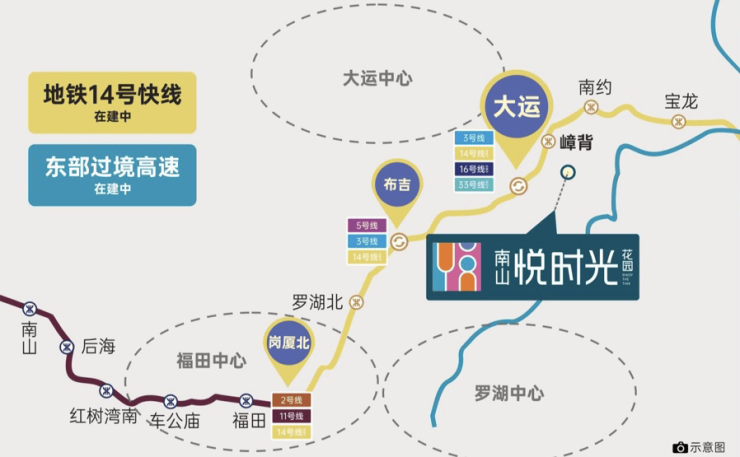 东部首条快线——14号线快线,时速达120公里,预计2022年9月底通车,南山悦时光毗邻嶂背站,1站大运,8站福田,30分钟直抵福田中心。