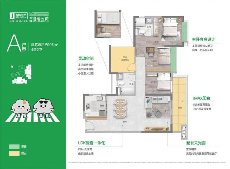 餐客厅约7m大面宽,约6m宽幕阳台,主卧套房设计