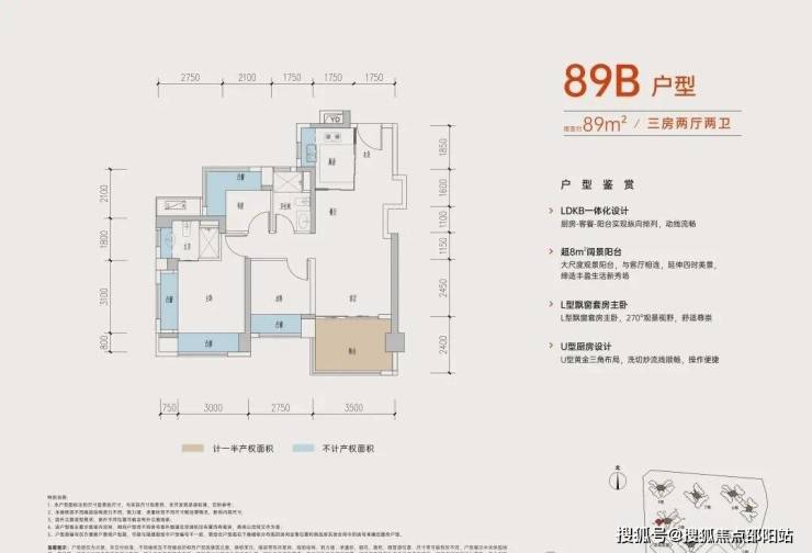 89㎡的3房2厅2卫,B户型,设计的是经典竖厅格局,进门入户玄关,客厅3.5米开间,三开间朝南,,主卧+1个次卧270°飘窗,3个卧室分别做到了主卧15.1㎡/次卧8.52㎡/次卧7.77㎡(包含墙体飘窗),得房率约:77.39%(不含赠送),西南朝向。赠送面积16.96㎡,加上赠送得房率96.84%。