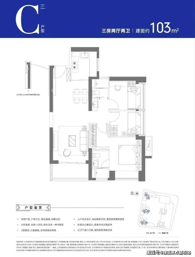 可售户型:103㎡三房两厅两卫、129㎡四房两厅两卫
