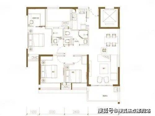 洋房户型;3室2厅2卫1厨, 建筑面积约98平米