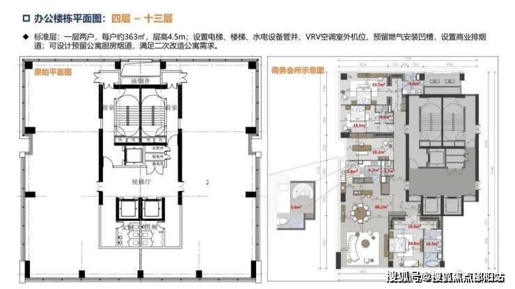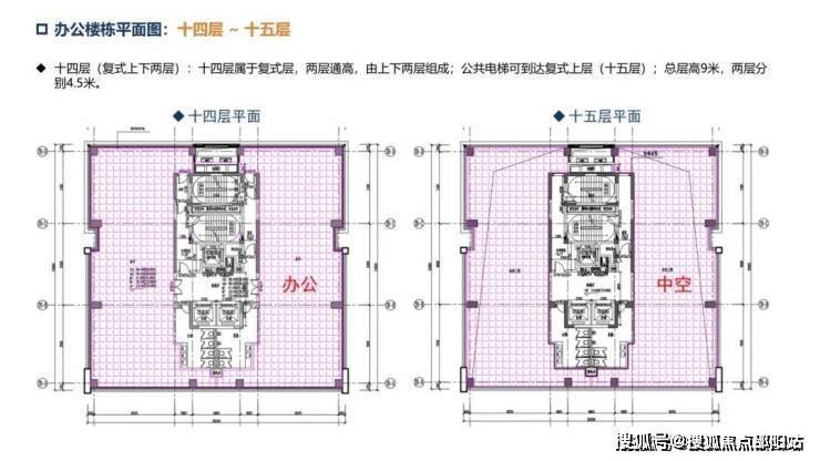 办公楼:层高约4.5米,两梯两户,单套270°三面采光环幕山海城港景观,14楼顶层复式,电梯可上15层。