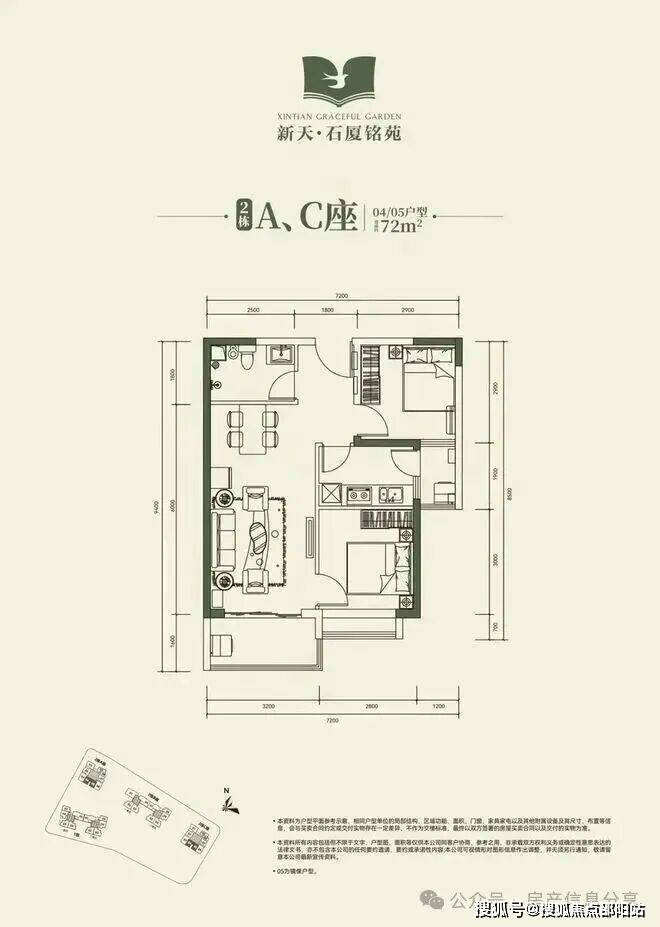 2栋B座二单元04、05户型:面积约为72-74㎡的2房2厅1卫。