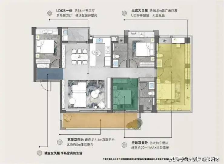 建面约151㎡四房:超64㎡的双巨厅,搭配约8.4米的景观阳台和约3米的生活阳台同时做到三面采光,全屋飘窗总长达约24.1米,属于同类面积段产品罕有的配置。