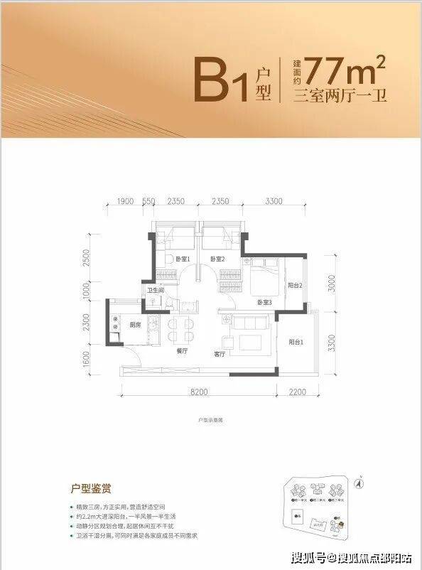 特点:LDKB一体化设计,主卧13.24㎡(含飘窗),次卧8.85㎡(含飘窗),次卧6.75㎡(含飘窗)。