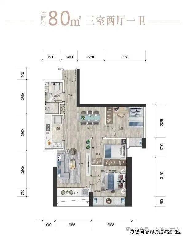 【户型②】北06/南07:约80㎡三房两厅一卫