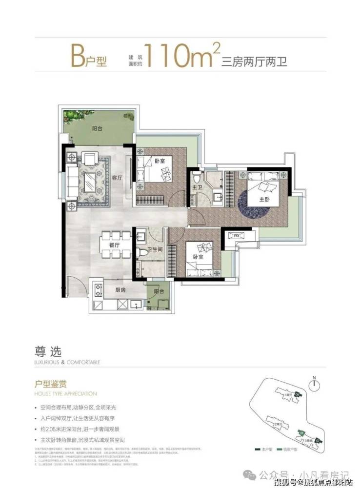 设计的是竖厅南北通透格局,进门入户玄关,客厅3.9米开间,LDKB一体化设计,动静分区,3个卧室分别做到了主卧16m/次卧12.3m/次卧9.56m(包含墙体飘窗),L型厨房还带1个小生活阳台,卫生间干湿分离,得房率约79.24%(不含赠送),东北朝向。