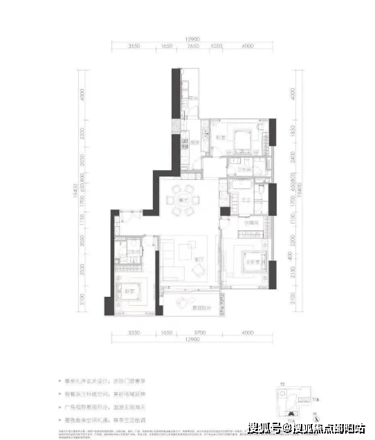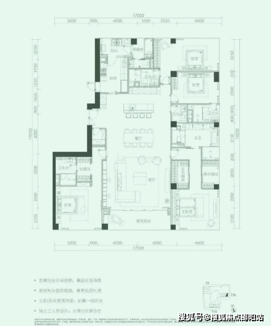 户型四套间设计,配备工人房,主佣分区,竖厅布局,约12m双厅进深,空间利用率很高。东端头位置,所有卧室都有开阔的景观,270°景观完全无遮挡。只存在T1B栋33-38层,仅6套。