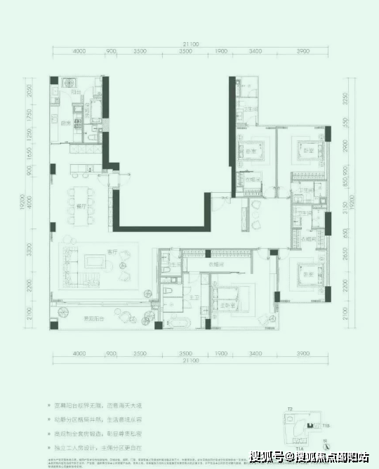 整个项目的楼王单位,只存在于高区33-38楼,极为稀缺。户型格局相当于T1A栋A户型的加强版,楼层更高,尺度更大,功能性更全面;增加了保姆间、起居室等空间,近80㎡的至尊主卧配备独立书房,收藏级产品。
