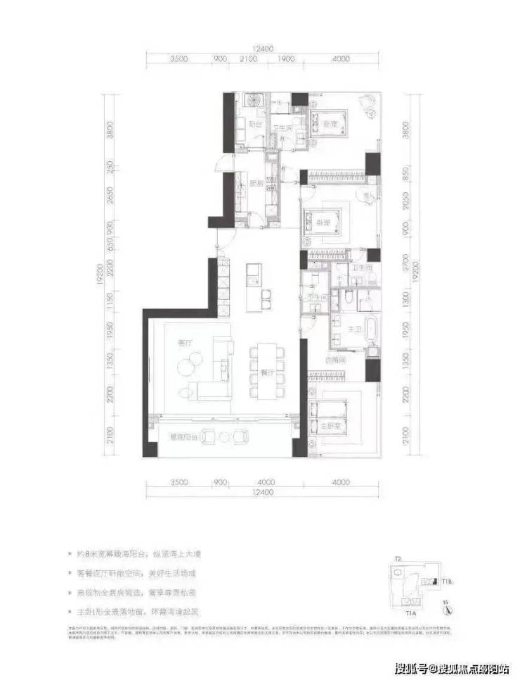 T1B栋B/C与T1A栋B/C格局相同,只是面积上略有差异。位置不如T1A栋,但是也能看不错的海景。个人认为C户型位置要优于B户型,因为南面海景和北面湾景视角都要大一点。