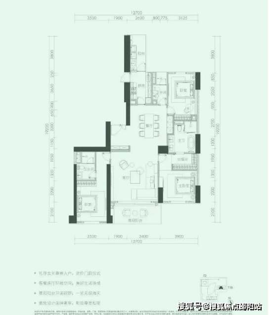 T1A栋F户型格局感觉是T1A栋D户型的削弱版,尺度更小,东西向面宽缩短,减少了一个房间。相同的景观面,但该户型楼层更高。不足之处在于,“中央公卫”设计很突兀,狭长的过道有点浪费面积。