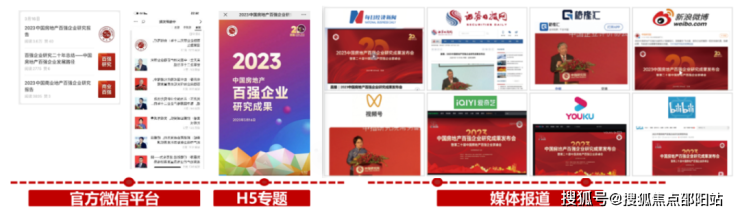 组织中央及地方权威媒体,通过电视台、电台、通讯社、报纸、网络、新媒体平台等多种形式,对2024中国房地产百强企业研究成果发布会进行全方位报道、直播;现场邀约数十家重点媒体与会,一起见证XX企业行业地位,提升社会各界对中国房地产百强企业的认知度,并将系列媒体报道形成《2024中国房地产百强企业研究成果发布会媒体汇编》,作为XX企品牌宣传的重要武器。