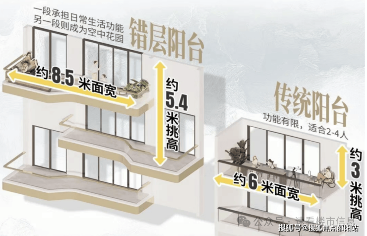 3) 享⼊户电梯厅,客厅开间 5.4 ⽶,阳台开间 8.4 ⽶,错层阳台 2 层通⾼,约 5.4 ⽶挑⾼享浩瀚江景。