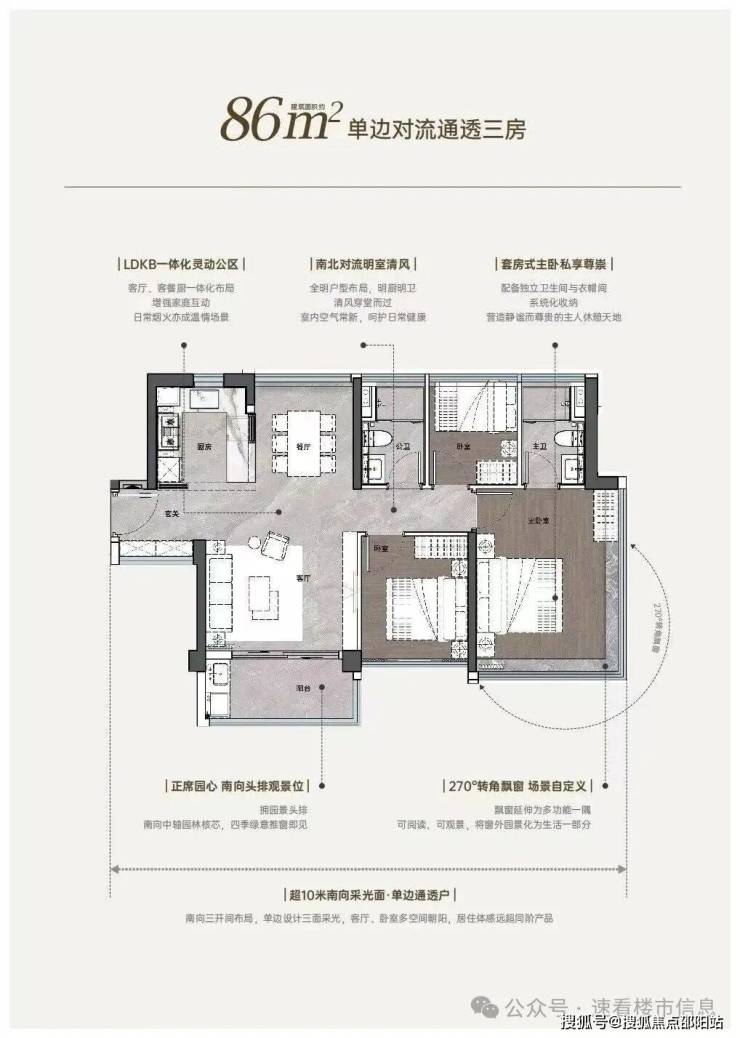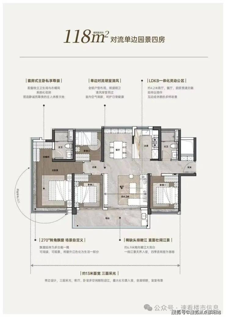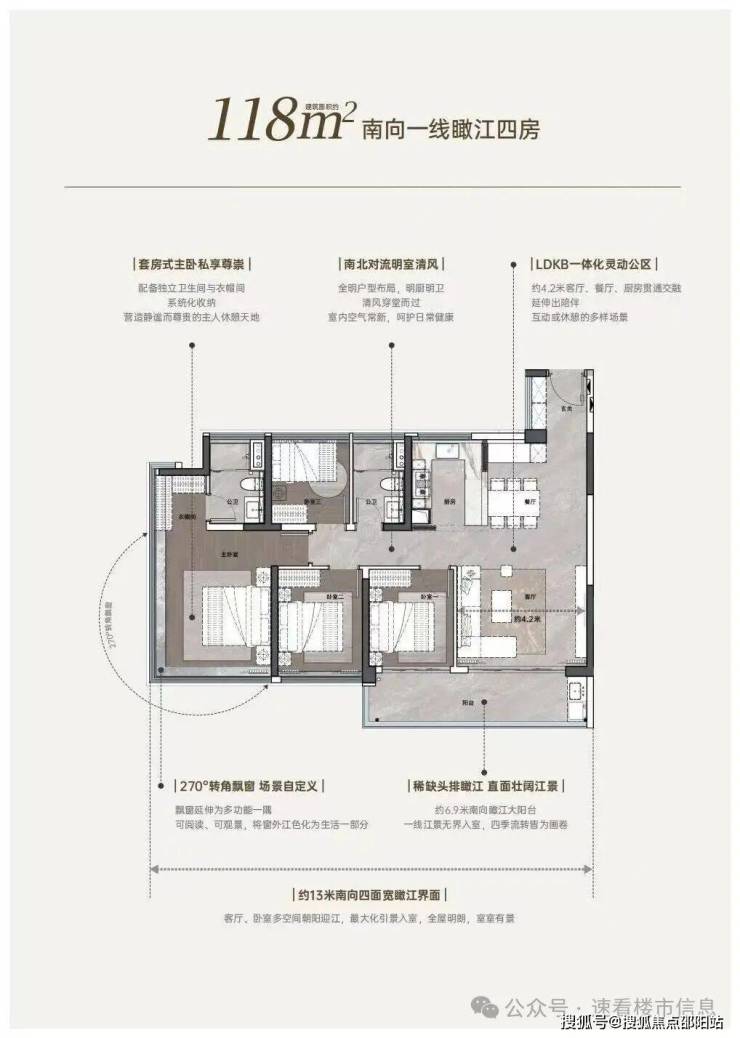 2) 户内私享约 20 ⽶五⾯观江界⾯,约 30 ㎡主卧 270°瞰江。