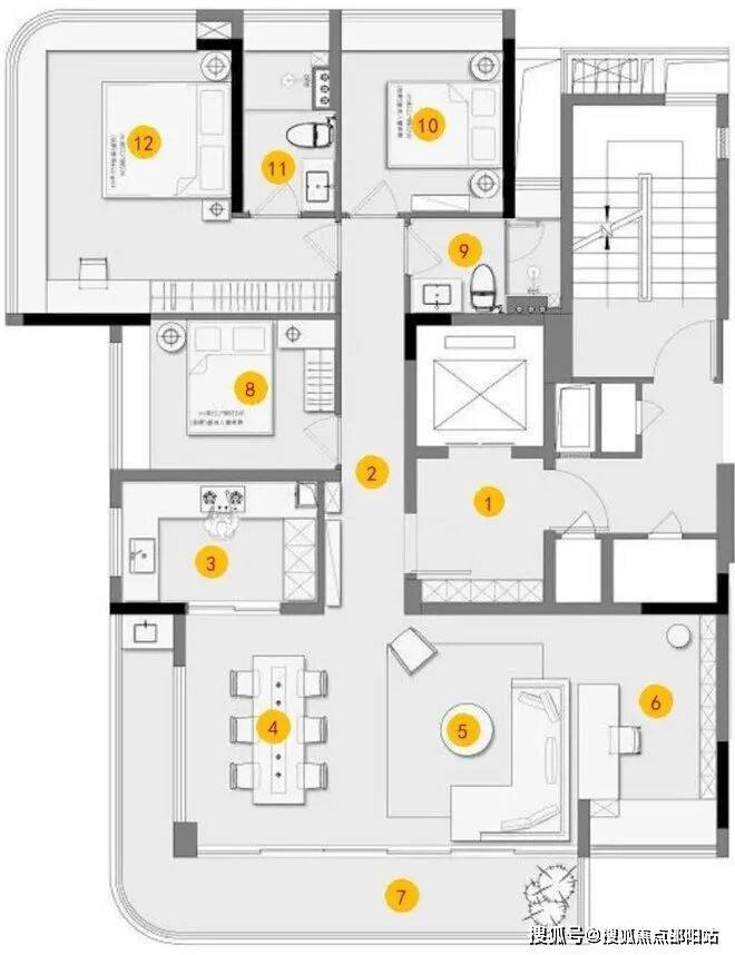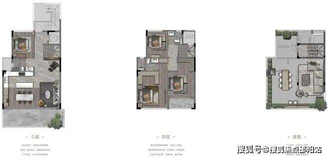 上叠为整栋楼的3-5层,3层主要设置次卧、公卫、客饭厅、厨房等,可以安排长辈居住,避免上下楼不便。