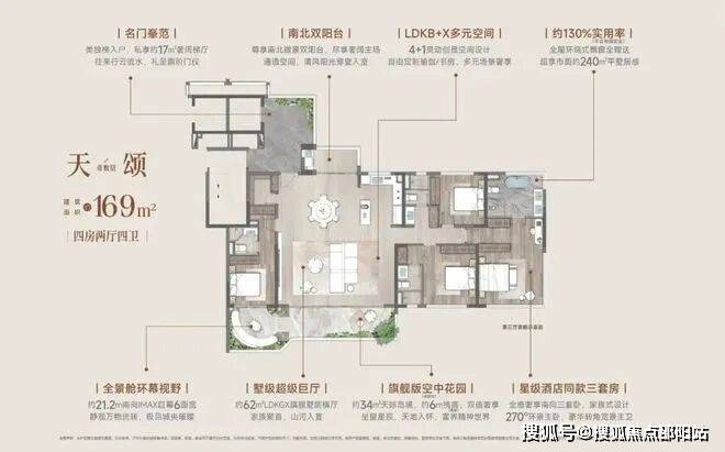 至高约130%实用率(不含电梯厅),空间功能比肩约240㎡+产品空间。约21.2米南向IMAX巨幕6面宽+约62㎡LDKG-X旗舰墅质横厅+34㎡旗舰版空中岛院+全维奢享南向三套卧+270°环景主卧,犒赏层峯鼎豪享受。