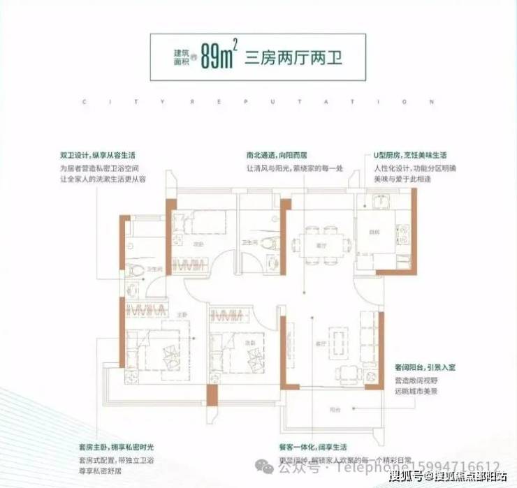 89㎡的3房2厅2卫,5栋01户型,设计的是竖厅南北通透格局,客厅3.6米开间,一体化双厅,三开间朝南,主卧270°转角飘窗,U型厨房,卫生间干湿分离,得房率:74.71%(不含赠送),阳台主朝西南向。