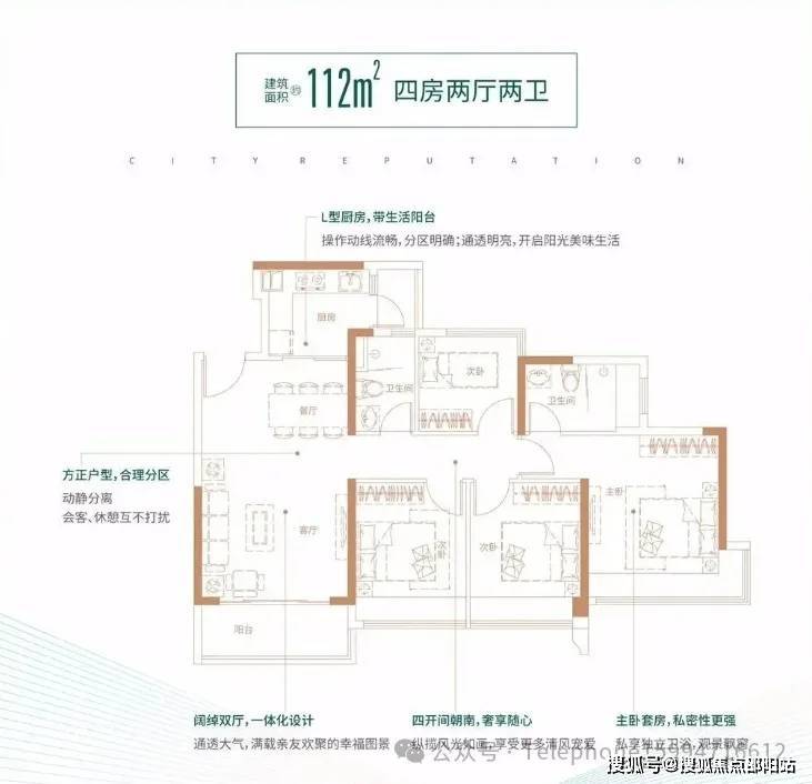 112㎡的4房2厅2卫,设计的是经典竖厅格局,客厅3.9米开间,LDKB一体化,动静分区,四开间朝南,主卧270°转角飘窗,L型厨房还带1个生活阳台,卫生间干湿分离,得房率:78.43%(不含赠送),东南朝向。