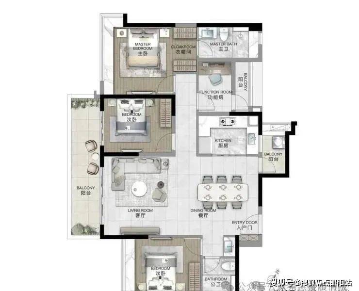 建面约143平3+1房,这个户型设计在市场上相对比较少见,进门左边就是一个次卧+公卫可以用作老人房,连接次卧的大阳台约7.9米,厨房旁边还有个小生活阳台。