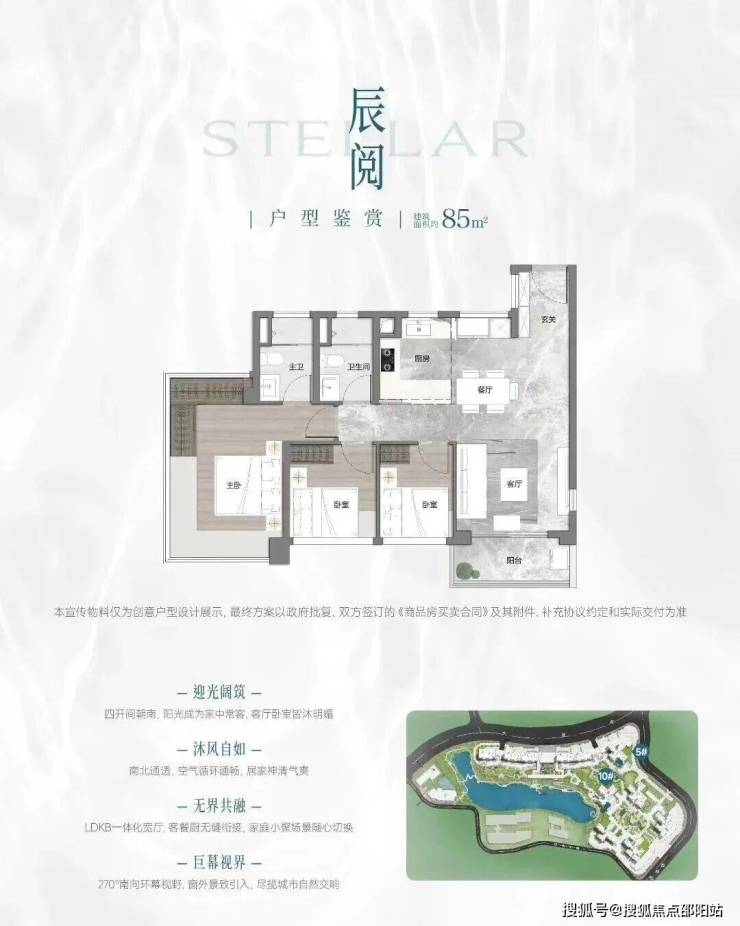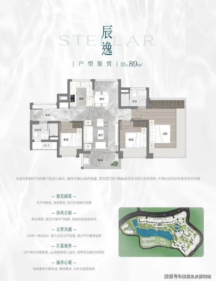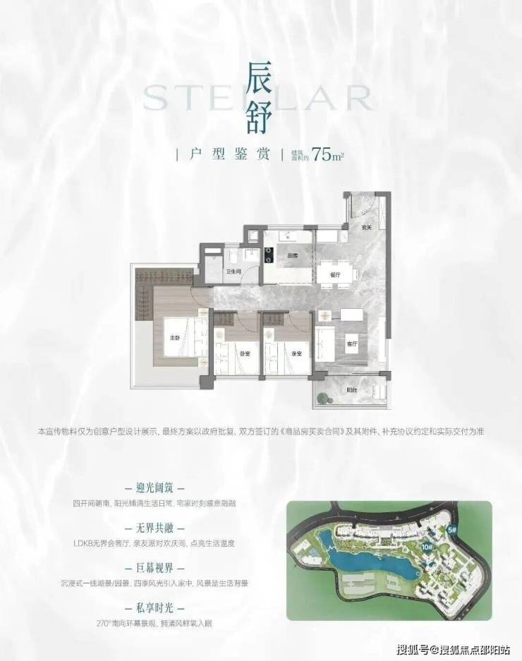 项目首推户型为建面约73-88㎡三房,住宅全南向布局,板楼可南向一线望映辰湖。