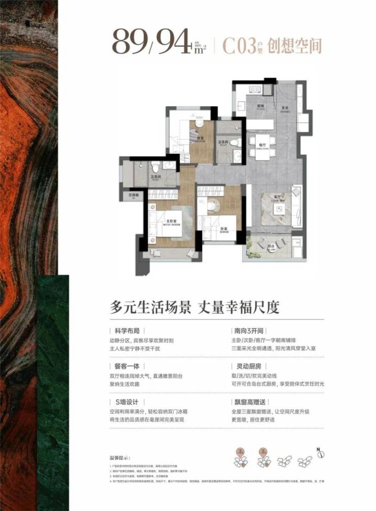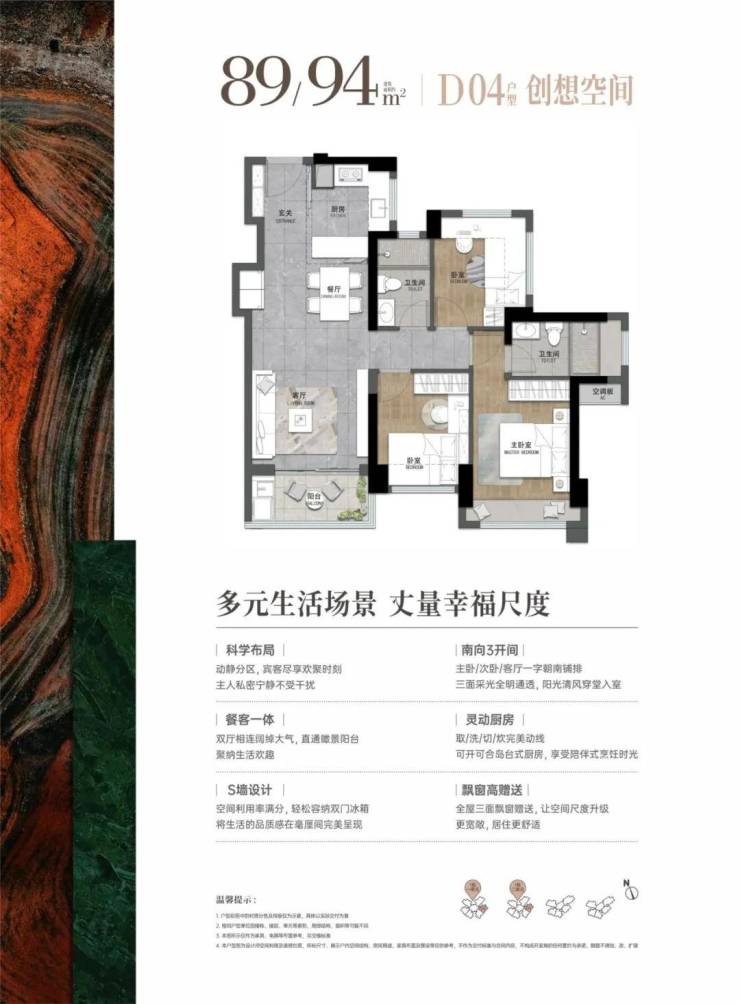 89-94㎡的4房2厅2卫,03.04户型,设计的是经典竖厅格局,进门入户玄关,客厅实测3.245米开间,LDKB一体化,S墙设计预留冰箱卡槽位,三开间朝南,3个卧室分别做到了主卧13.76㎡/次卧8.28㎡/次卧7.74㎡(实测面积,不含墙体),U型灵动式厨房,卫生间干湿分离,得房率约76-81%(不含赠送),东南朝向。