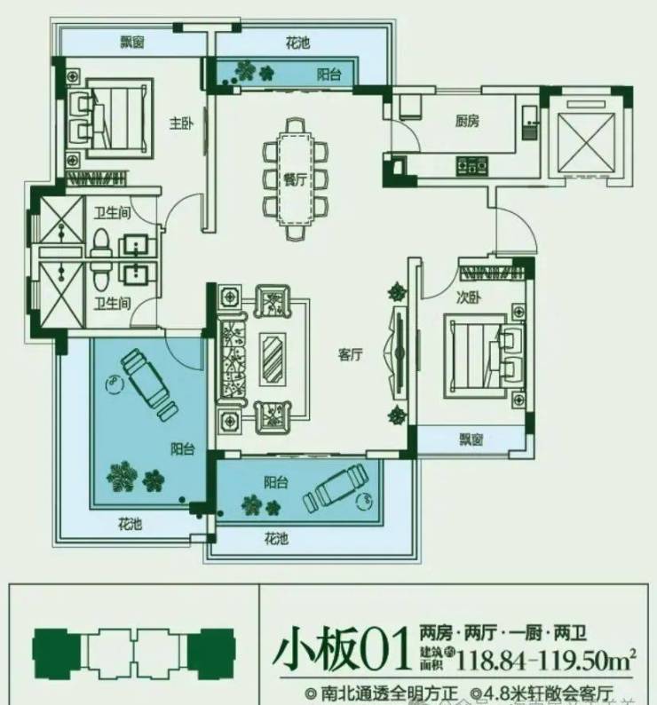 建面约118㎡,2房2厅1厨2卫
