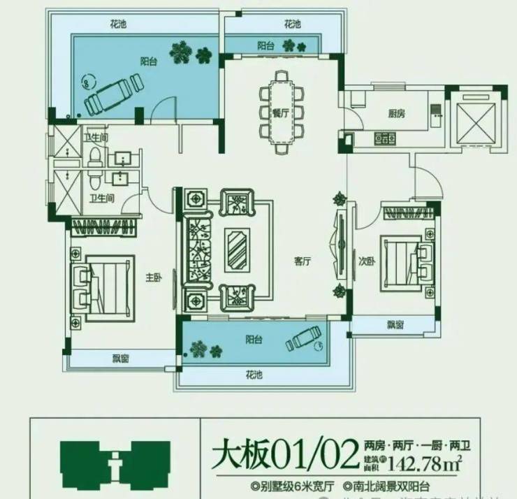 建面约143㎡,2房2厅1厨2卫