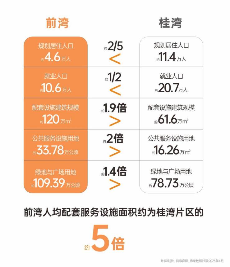 按照居住人口计算,前湾人均配套服务设施面积约为桂湾片区的5倍。这意味着,前湾的居住人口能享受到更丰富的配套服务。(数据来源:深圳前海管理局官网 摘录时间:2023年4月)