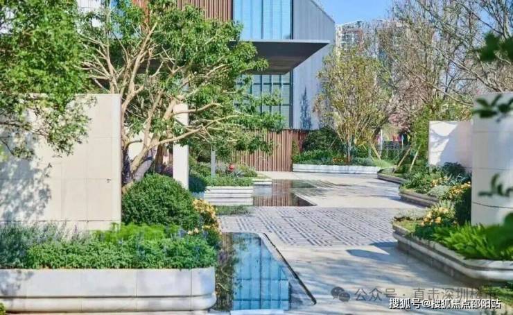 园林以“湾区之舞”为理念,串联花园层各个节点,引入两轴六境场景,塑造多元感知空间、全时全景的私享休憩馆、“酒店式”迎宾与归家动线、移植四季皆景的花草树木,打造自然奢享城市花园。