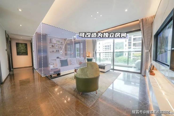 同样是动静分离的格局,不同的是它的阳台更显阔气,连通了客厅和客卧,形成超大开间,透过实景板房,已经能看到窗外的绵延山体。