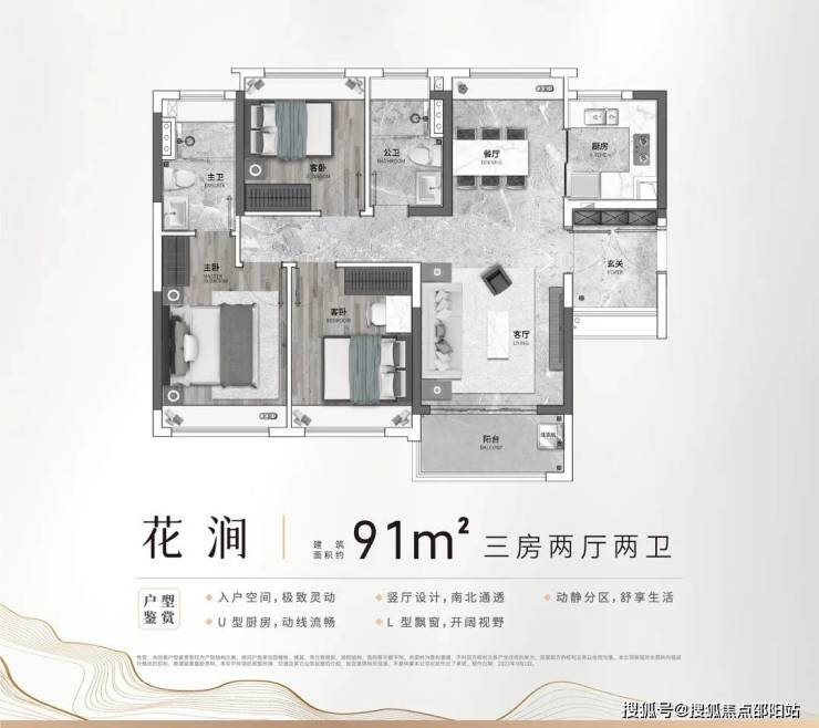 户型整体动静分离,能保证休息空间的安静,主卧不仅为套房设计,还能做到真正的南北通透,清风可无遮挡穿过。