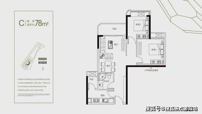 建筑面积约76-78㎡2房+1卫(灵活多变+1多功能空间)