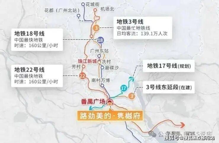 项目距离地铁番禺广场站约 900 米距离,囊括已开通的广州地铁3号线、18 号线、22 号线,3号线东延段,未来规划有广州地铁 17 号线,5 轨汇聚于此,如此便捷的交通路网是其他板块难以比拟。