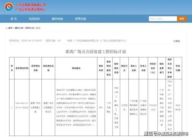 当前,番禺广场及公园复建工程招标计划已公布,预计总投资约1.6亿元,复建地上广场及公园面积约104637平方米,新建地上总建筑面积3850平方米。包括科技体验中心800平方米、文化展览800平方米、科普活动500平方米、游客服务中心500平方米等,将进一步崛起中轴发展新主场。(信息来源:广州交易集团有限公司官网)