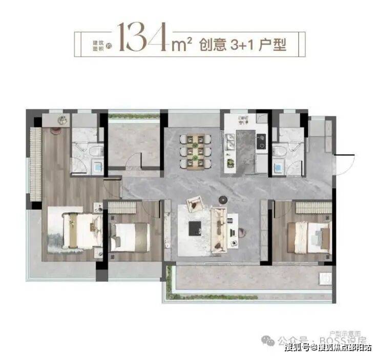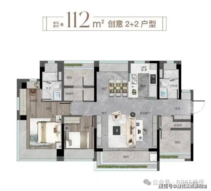 路劲美的隽樾府建面约 112㎡户型属于 LDKB 一体化大方厅搭配 2+2+X 的设计。
