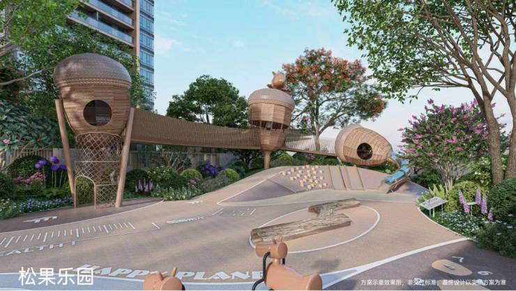 全龄共享运动区:松树下的主题乐园,形成看护与运动一体化的共享模式。