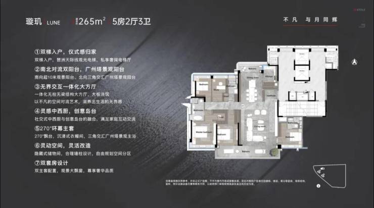 建面约265㎡户型,客厅、餐厅以及厨房的无缝相连,创新LDK竖厅设计,为家人们营造出宽敞而舒适的灵感生活剧场。在一体化无柱设计下,约19米连续开窗面赋予了空间270°的流光巨幕,让光影可以肆意在室内斑驳出通透的艺术美感。
