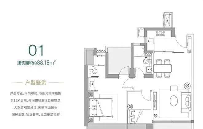 建面约88㎡三居两卫住宅,三开间朝南,推窗见南山