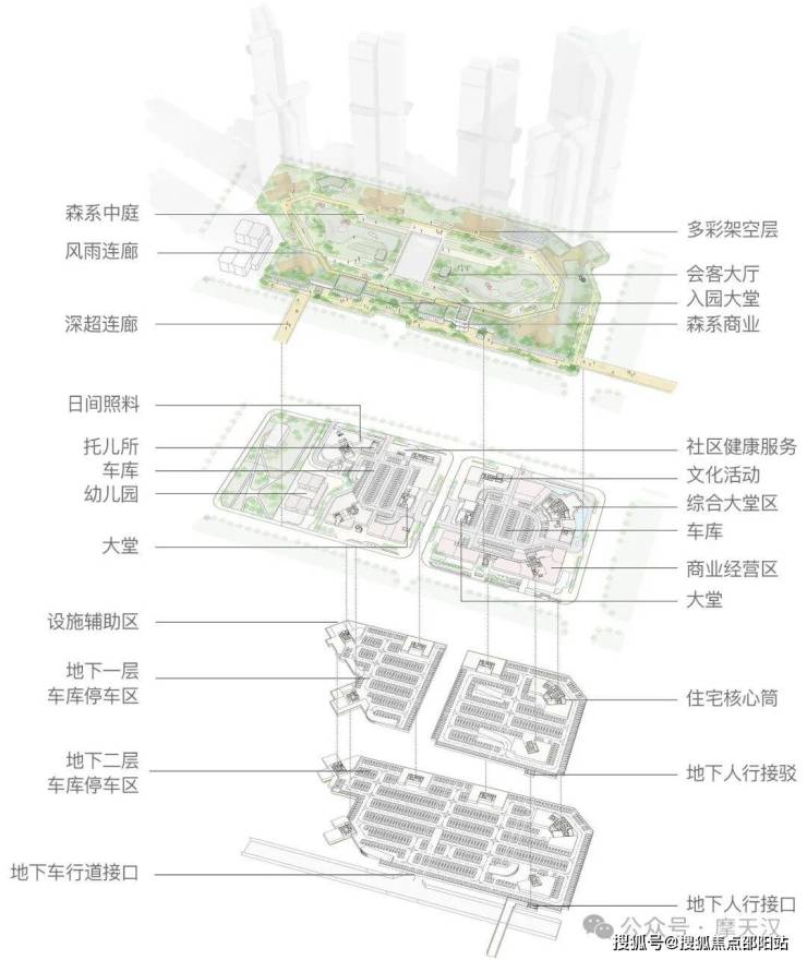 在整体规划方面,提出一种山海之间的超级栖息地,将车库、商业设施和社区配套等不同功能平层叠加,以满足不同高度的使用需求,并形成贯穿街区的完整空中花园。